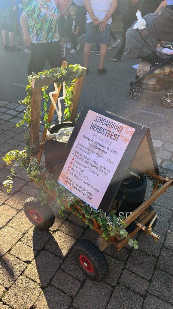 Um 14 Uhr ging es dann los, der große Umzug durch Hirschaid. Natürlich nicht einfach so, wir hatten unseren Bollerwagen voller 30 Liter Freibier am Start. 🍻 Damit ihr unterwegs nicht verdursten müsst, haben wir fleißig ausgeschenkt und mit euch angestoßen. Stimmung? Überragend!